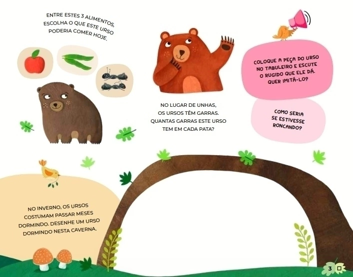 Detalhes sobre os ursos, corujas, lebres são apresentados às crianças entre três e cinco anos ao longo das narrativas, Uma caneta com apagador acompanha cada livro, assim como personagens destacáveis que, ao ser encaixados, emitem sons característicos,